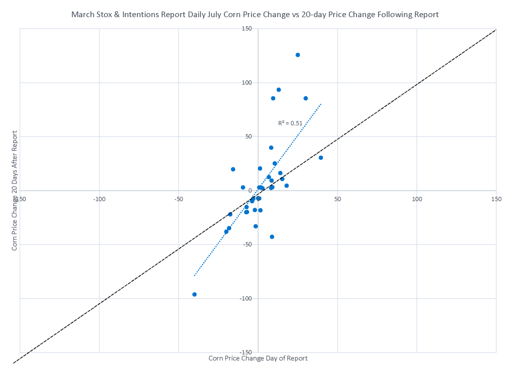 Looking back through history, despite this report’s reputation as a ball buster, it has more often been a turning point toward higher prices, rather than a crash and burn. Out of the past 35 years, the July corn contract has closed lower on the March NASS report only 13 times, for an average drop of 12 cents, and has only closed more than a dime lower on the day 5 times, for an average drop of 22 cents. While there has been absolutely no correlation between price action before and after the report, whatever happens on report day tends to continue. As shown in the plot (below), if the market falls at least a little on report day, it usually drifts even lower over the next 20 days or more. In those 13 years the corn market closed lower on report day, between March 31st and June 30th is 40 cents lower. In other words, a lower close on Monday will be a bad omen for the next 90 days.
